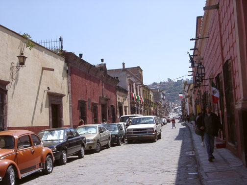 San Miguel de Allende is one of the oldest and prettiest of Mexico's colonial cities. Settled in 1542 by a Franciscan friar, it is located near the geographic center of Mexico, 180 miles NW of Mexico City. At an altitude of 6,300 feet, the town has a nearly flawless climate with sunny days and cool nights year around. It is dry much of the year but in summer, late afternoon rains turn the surrounding countryside into a lush green landscape. The city was declared a National Historic Monument in 1926. There are some steep streets and alleys, many of the sidewalks are exceedingly narrow, and many of the streets are paved with cobblestones. The pace is slow, the people are friendly, and the weather is incomparable. More pictures below. To see the full-size image, click the thumbnail image. First is the Parroquia (parish church), San Miguel's best- known landmark. Then three street scenes in San Miguel. |