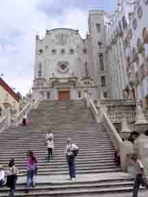 At right is Harry on the lower steps of the University of Guanajuato. The origin of the University goes back to the arrival of the Jesuits and their founding of the College of the Holy Trinity in 1732. In 1828 it became the property of the Government of the State and was renamed the State College. In 1945 it gained university status. This impressive neoclassical style building, made of green stone, currently houses the Rector's Office and administrative and academic offices, as well as a number of the University's schools and faculties. We visited the Don Quixote museum; we climbed the hundreds of steps up to the statue of El Pipila. The Pipila monument was erected in 1939. The rose colored sculpture is in honor of Juan Jose de los Reyes Martinez. "El Pipila," as he came to be known, was the hero of the struggle for Mexican Independence. By setting fire to the portal of the Alhondiga de Granaditas (the grainery) with a torch, he made it possible to take the building on September 28, 1810. Following is a picture taken from the hill where the monument is located, looking down on the city. (Click on the thumbnail.) Notice the man standing at the edge of the terrace, lower left, to gain perspective of the height. |