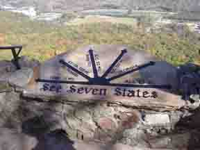 We left Houston on 10/27/01. The only "have to" was that we reached Nashville by the morning of Nov. 3rd, where Harry would attend a seminar for the week end. We spent the first night at a motel in Tuscaloosa, Alabama. The weather was cold, probably below freezing. The next day, 10/28, as we got into Tennessee we started seeing the many signs urging us to see ROCK CITY. This is advertised as being naturally formed "streets and avenues." In 1936 the owner began a barn roof advertising campaign to lure vacationers from the highways. By the 1950s, "See Rock City" was painted on 900 barn roofs from Michigan to Texas. There were indeed some huge rocks and interesting views - but much of the "attraction" was also man-made. We later found that the hikes we did in the mountains later (for free, or a dollar or two parking fee at the trailhead) were much more enjoyable. (Fewer people, too - we value our solitude.) One point at Rock City claimed visitors could view 7 states from there - and had a sign pointing the way. Picture on the right - Arrows point the way: 1/2 mile to TN; 120 miles to KY, VA; 50 miles to NC; 80 miles to SC; unreported mileage to GA but it's close; and 25 miles to AL. Click for more pictures and information about Lookout Mountain and Rock City |