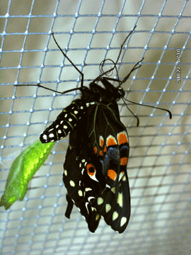 Saturday morning, 6/29/02 - The first of our seven hatched out! Left to right, the butterfly is emerging from the chrysalis. |