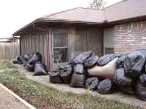 Left: some of the hundreds of bags of leaves and grass Harry has picked up to use for compost. Right: Harry digs way down to the yucky gumbo to layer compost on top.