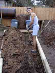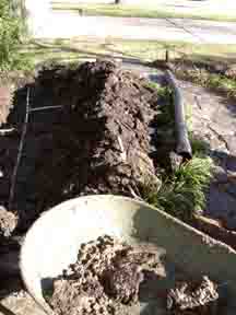 Right: digging down and removing about a foot of the awful gumbo soil to be trucked away and replaced with good soil.