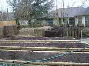 Left: compost pile and leaves in the background. Foreground, the three raised beds Harry made, almost ready for planting. First, we want to rototill in some sand.