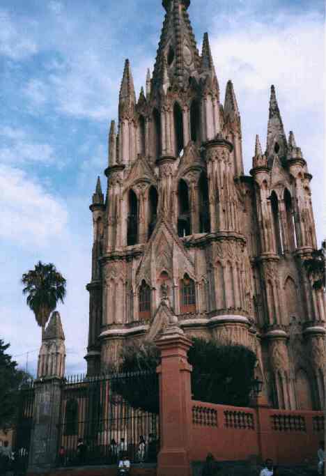 San Miguel de Allende is one of the oldest and prettiest of Mexico's colonial cities. Settled in 1542 by a Franciscan friar, it is located near the geographic center of Mexico, 180 miles NW of Mexico City. At an altitude of 6,300 feet, the town has a nearly flawless climate with sunny days and cool nights year around. It is dry much of the year but in summer, late afternoon rains turn the surrounding countryside into a lush green landscape. The city was declared a National Historic Monument in 1926. There are some steep streets and alleys, many of the sidewalks are exceedingly narrow, and many of the streets are paved with cobblestones. The pace is slow, the people are friendly, and the weather is incomparable. More pictures below. To see the full-size image, click the thumbnail image. First is the Parroquia (parish church), San Miguel's best- known landmark. Then three street scenes in San Miguel. |