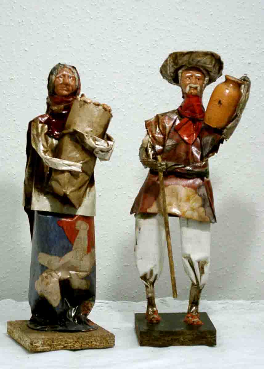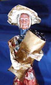 Charming paper mache figures - various parachuting clowns, and at right two of many different varieties of viejitos (old Mexican peasants) approximately 12-inches tall. Far right, a closeup of one. | ![]() |