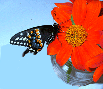 This is a male, I think. They don't have as much blue on the bottom part of the upper surface of the wing. We put him on flowers in a vase while his wings dried. We set the vase on the front porch, and before long, he flew away to share his beauty with others. Isn't he BEAUTIFUL??? Watching this