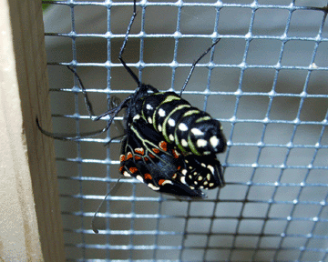 Saturday morning, 6/29/02 - The first of our seven hatched out! Left to right, the butterfly is emerging from the chrysalis. |
